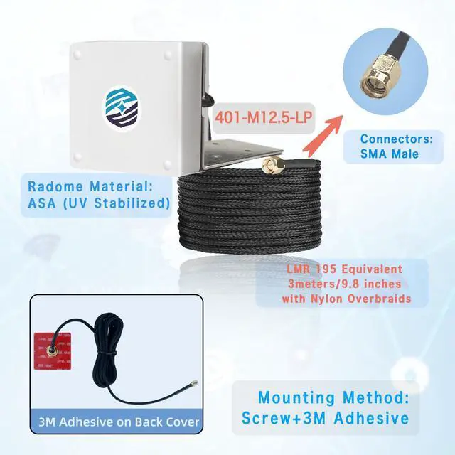 Screw and 3M Adhesive Dual Mount: The antenna comes with standar M12 Screw and Nut for Screw mount as well as 3M adhesive under the radome for permanent outdoor installations.