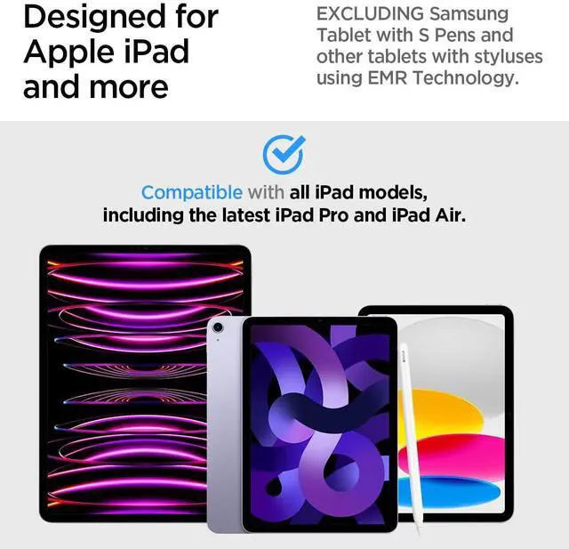 Designed for Apple iPad and more: Compatible with all iPad models, including the latest iPad Pro and iPad Air. Also compatible with any tablet EXCLUDING Samsung Tablet using S Pens (and other tablets with styluses using EMR Technology).