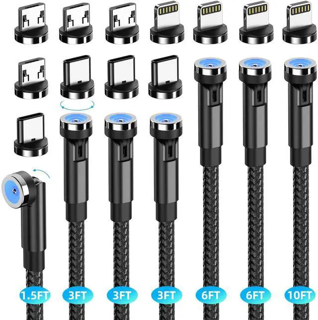 7-Pack 1.6FT /3FT/3FT/3FT/6FT/6FT/10FT 540 Rotating Magnetic Phone Charger 3 in 1 Magnetic Cable Nylon Braided USB Charger Cable for Micro USB/Type C/iProduct Device - Black