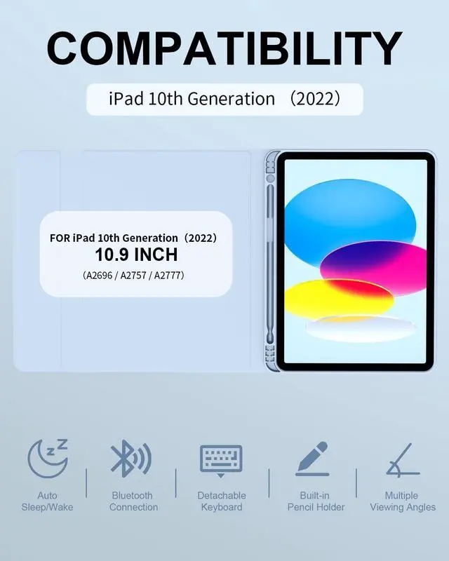 Compatibility ModelThis iPad case with keyboard is designed for iPad (A16) 11th Generation 2025 11 inch, iPad 10th Generation 2022 10.9 inch ( Model: A2696/A2757/A2777 ). NOT compatible with any other iPad models. Please check the back bottom of your iPad to find the model number before placing order.