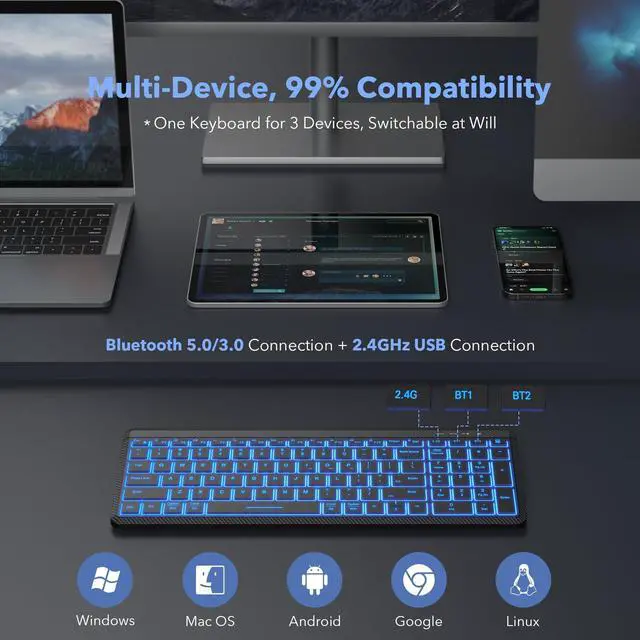 BLUETOOTH DESIGN: To meet the needs of Apple users, it has three connection methods (2.4GHz+BT3.0+BT5.0), which can connect three devices at the same time and switch between the three devices at will. compatible with 99% of devices and operating systems (MacBook Pro/Air, iPad, iMac, iOS, Android, Ipad, etc.).