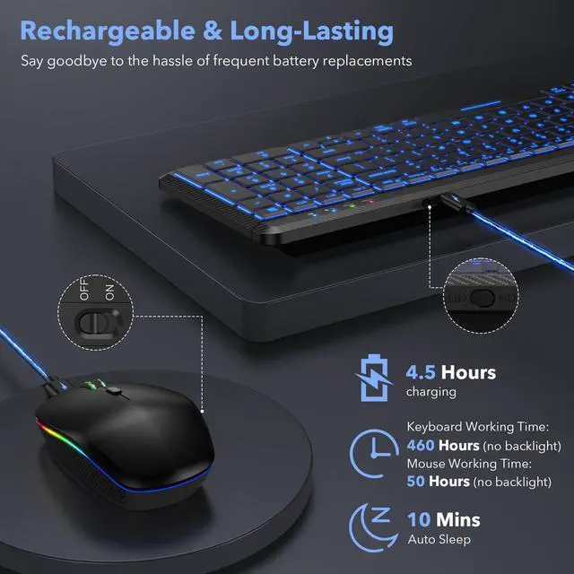 ENERGY SAVING MANAGEMENT: Thanks to its rechargeable design, you can permanently say goodbye to the trouble of frequent battery replacement. The keyboard and mouse are equipped with 1500mAh and 650mAh batteries respectively, which can be used for up to 270 days.