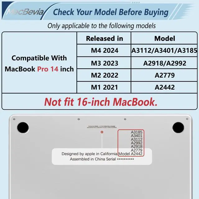 Note: This case is designed exclusively for the 14-inch MacBook Pro with Touch ID (2025 2024 2023 2022 2021 Versions), Only compatible with Models:M5 A3434/ M4 A3112 A3401 A3185/ M3 A2918 A2992/ M2 A2779/ M1 A2442. Please check the model number on the bottom of your MacBook Pro to ensure compatibility