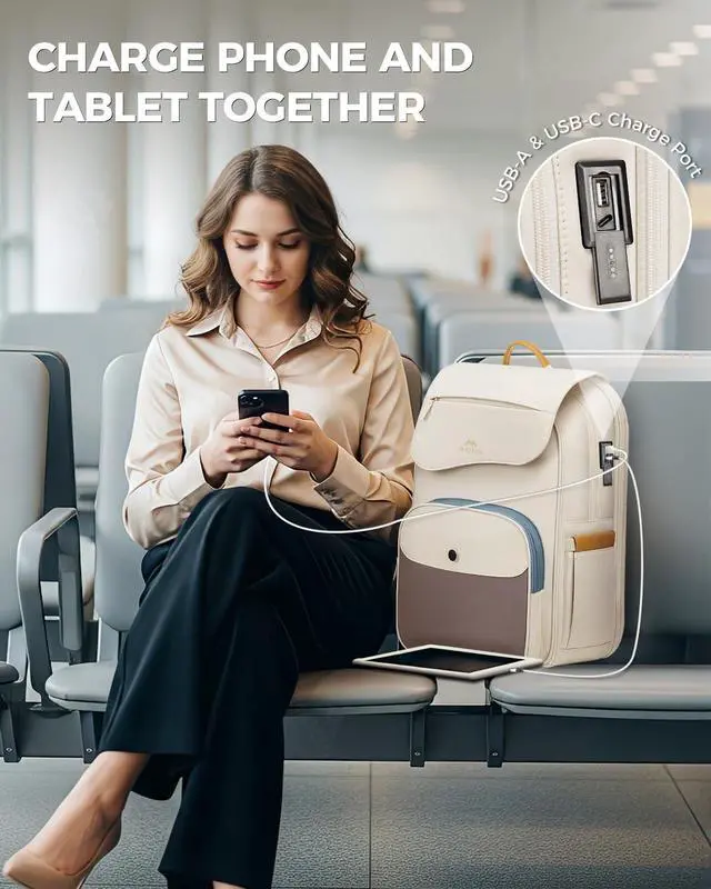 Separate Cosmetics & Jewelry Pocket: Professional womens backpack for work has a thoughtful front organizer pocket for makeup and jewelries. Inside, elastic loops hold foundation, brushes, lipsticks securely, while a soft velvet-lined clear pouch protects necklaces, rings, earrings from scratches. Designed for work and professional business women who need to quickly apply makeup or change essentials between meeting or commutes. Great backpack for women work, no need to bring an extra makeup bag