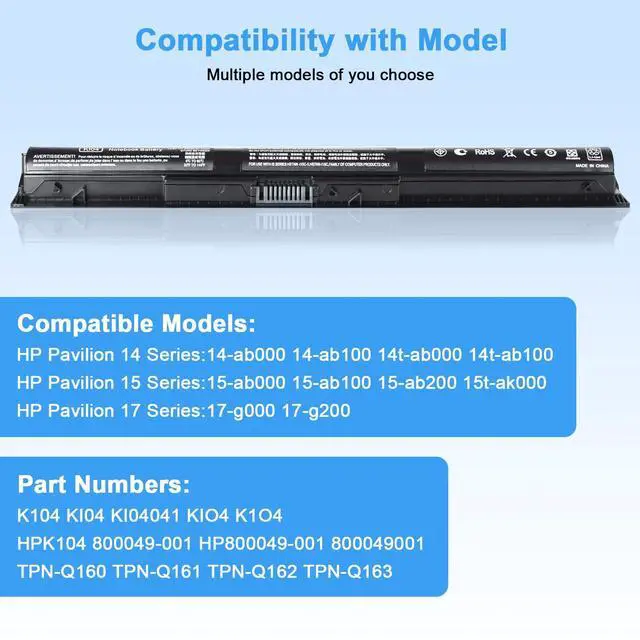 • Compatible P/N: Compatible with HP Pavilion Spare KI04 K104 800009-241 800009-421 800010-421 800049001 800050001 HSTNN-LB6R HSTNNLB6S HSTNN-DB6T HSTNN-IB6X TPNQ158 TPN-Q159 TPN-Q160 TPN-Q161 TPN-Q162 TPN-Q163 Notebook Battery