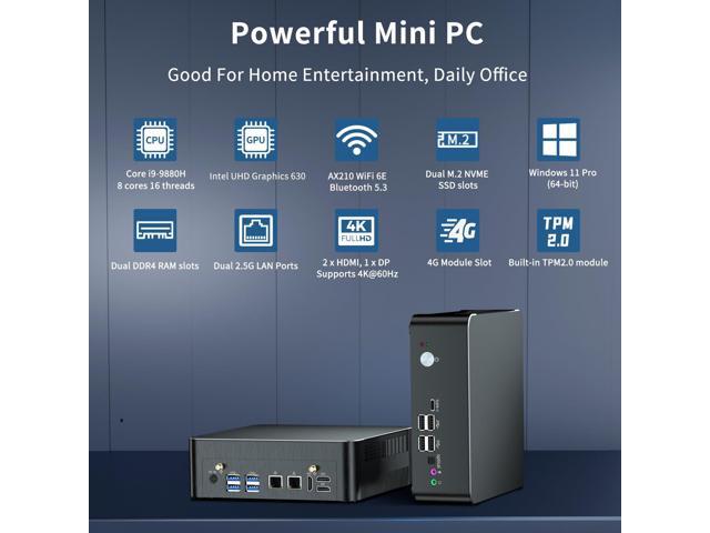 - [High Performance] Mini PC equipped with Core i9-9880H processor and UHD Graphics 630, 8 cores 16 threads, 16M smart Cache, base frequency: 2.3GHz, max 4.8GHz. and MAX 45W TDP that takes processing speeds and energy efficiency to new heights. Pre-installed with Windows 11 Pro (64bit) OS, Also supports Linux OS. This Mini PC is ideal for diverse usage scenarios such as entertainment, games, design, office, online education, industry, etc.