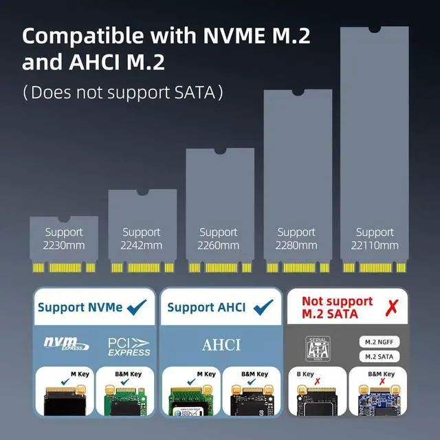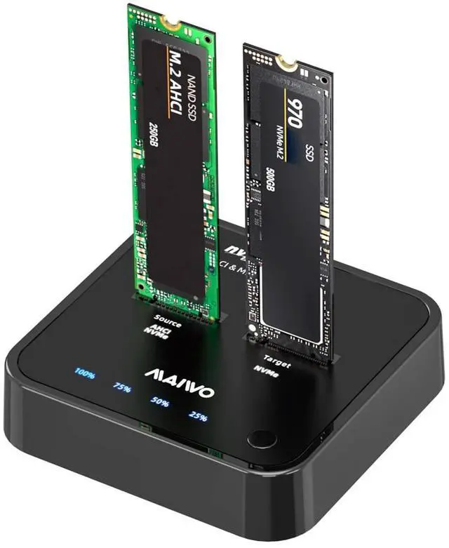 CompatibilityThe MAIWO dual M.2 NVMe to USB dock supports M-Key SSD sizes 2230/2242/2260/2280/22110. It has read/write and clone functions. It equipped with a C to C cable and a C to A cable which can easily complete the mission of accessing desktop computers/laptops/phones/tablets for data transfer and cloning(phones must support OTG).