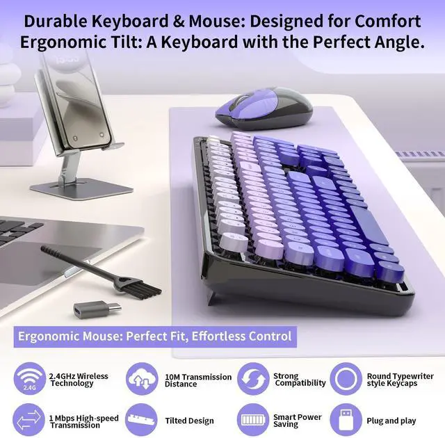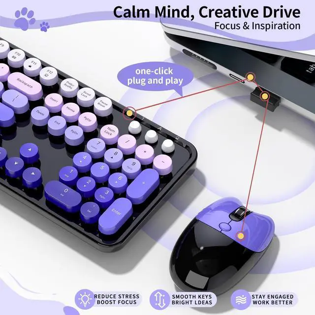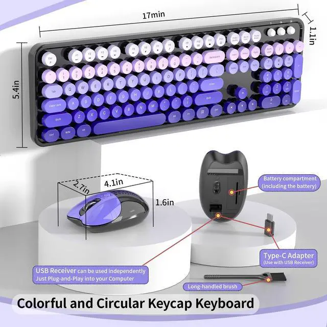 Retro Floating Round Keycapscolorful keyboard and mouse wireless with vintage typewriter-inspired retro floating rounded keycaps, gives you the most comfortable typing experience and adds some much needed spunk to your desk.The crisp key sound takes you back to the industrial era, and the independent round keycaps facilitate finger positioning. The floating keys under your fingertips are comfortable and skin-friendly