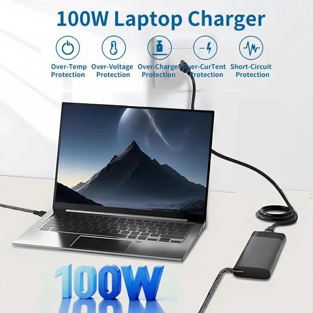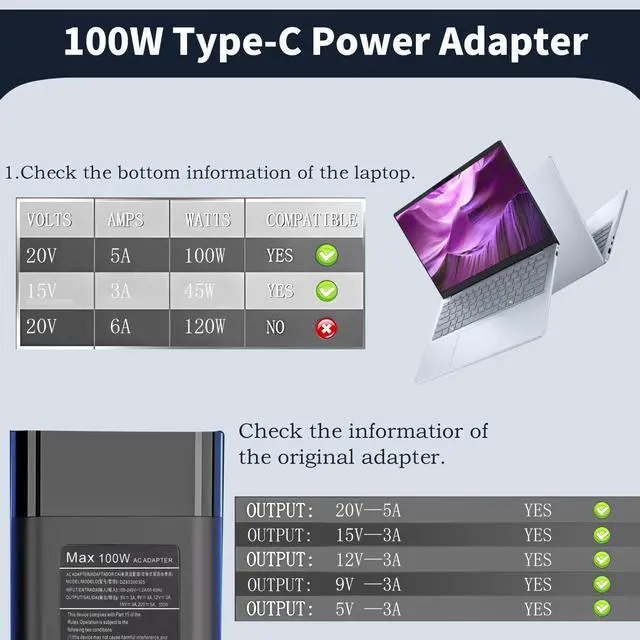 AN·GWEL 100W USB C Charger Specification: Input:100-240V~1.2A 50-60Hz Output:5V/3A, 9V/3A, 12V/3A, 15V/3A, 20V/5A 100W Max.Please compare your original Laptop or Tablet charger.