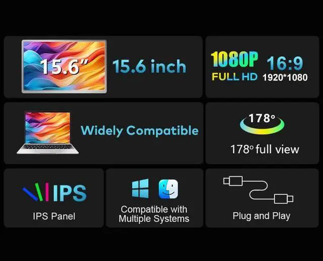 Laptop Screen Extender for Triple Display - 15.6" FHD 1080P Portable Monitor For Laptop, USB C Detachable Plug & Play laptop Monitor Extender for 12"-18.5", Compatible with Windows/Android/PS4/MacBook