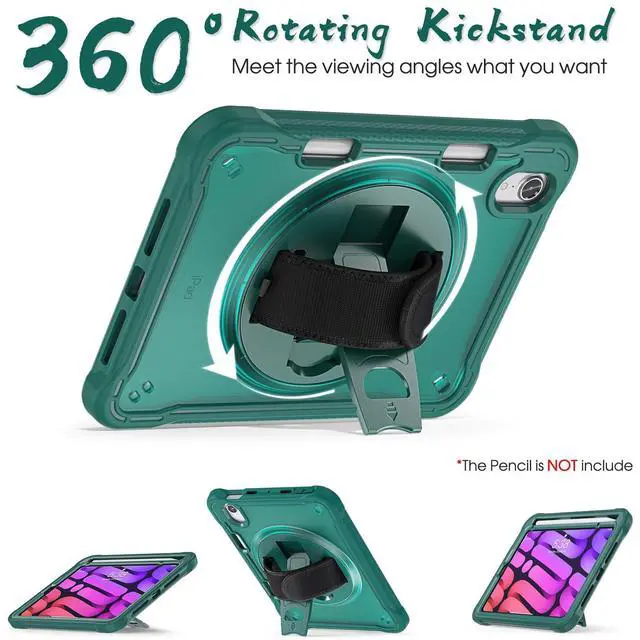 BRAECNstock Case for iPad Mini 7 (A17 pro) 2024/ Mini 6 8.3", Shockproof Protective Cover with Pencil Holder, Screen Protector, 360° Rotating Hand Strap/Stand for iPad mini 7th/ 6th Gen, Midnight Green
