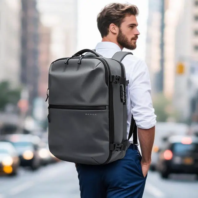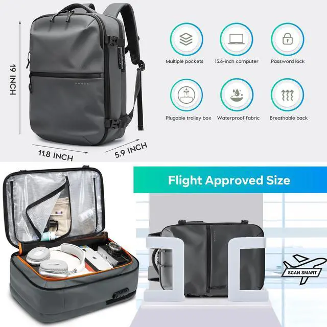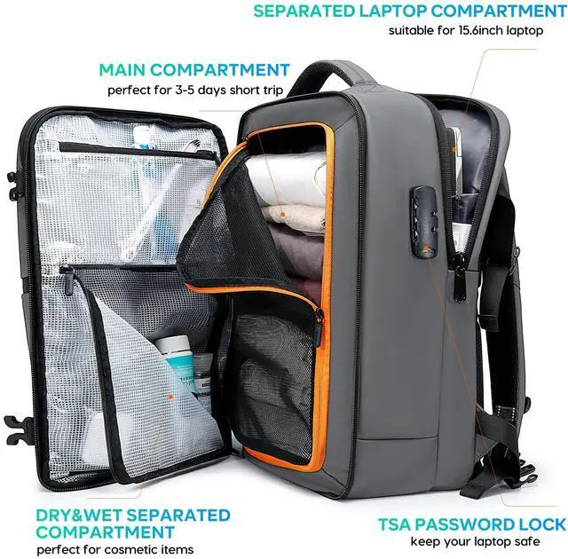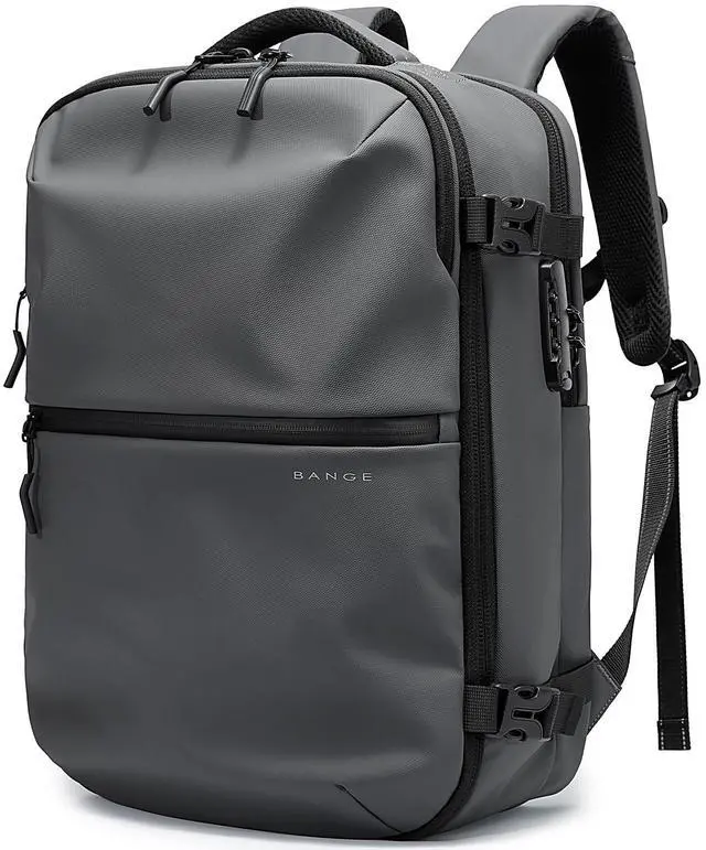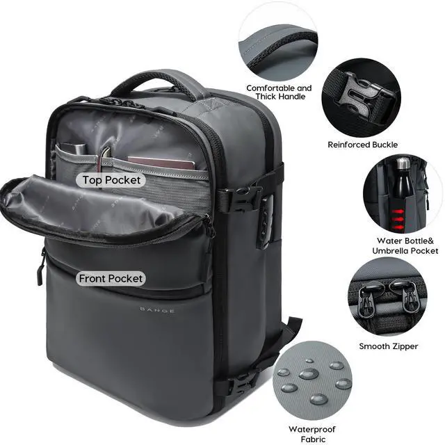 Smart & Organized Large Capacity BackpackWith dimension 18.9*11.7*5.9inch and 32L capacity, BANGE backpack features multiple compartments, including a large main compartment for business traveling, a padded laptop sleeve for 15.6inch laptop, two front pocket for quick-access essentials, two separate wet pouch secures liquids for cosmectics, and two shrink side pockets for water bottle or umbrella. This backpack is ideal for air travel, camping, or short getaways.