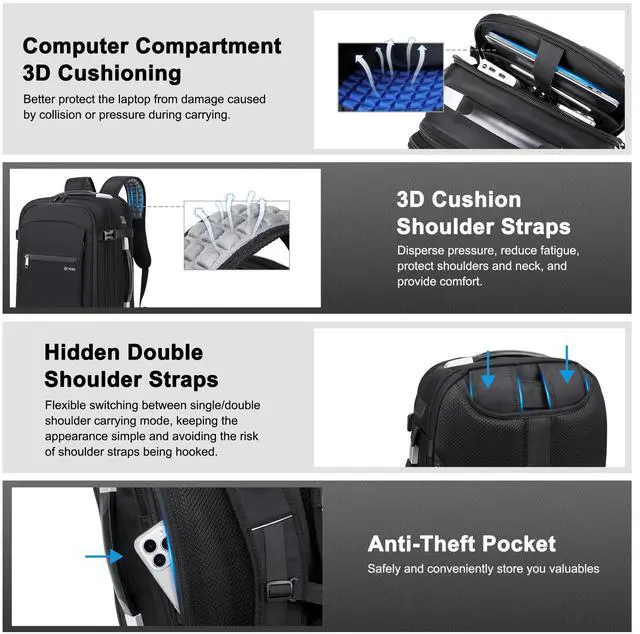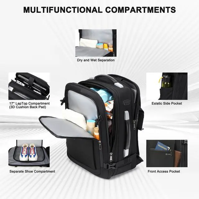 Efficient Storage Solutions: Fitting 5x more items than a regular backpack. Organize your belongings with three main compartments and multiple hidden pockets. A dedicated wet/dry separation pocket keeps damp clothes isolated, while a secure laptop compartment accommodates up to a 17-inch device.