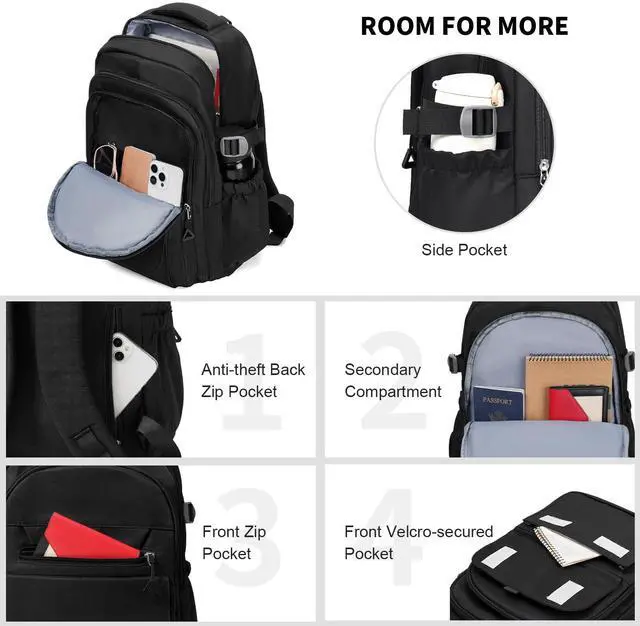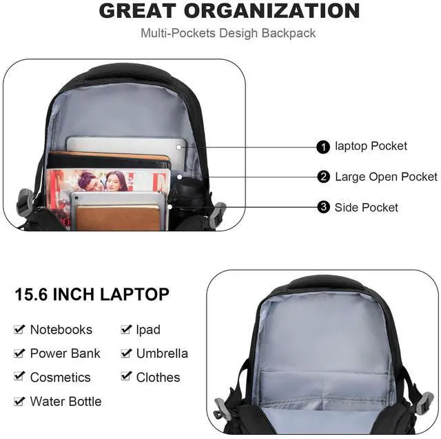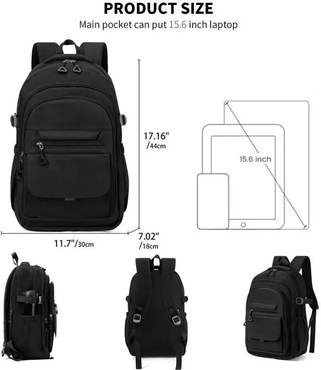 Smart Organization: The main compartment features a dedicated laptop sleeve ( fits up to 15.6 laptop ), a main storage section, and two interior slip pockets. The anti-theft rear zip pocket safely stores valuables like phones and wallets. Side pockets with adjustable straps securely hold water bottles or umbrellas