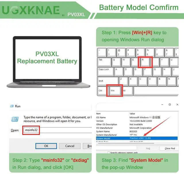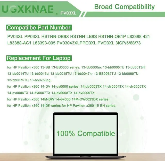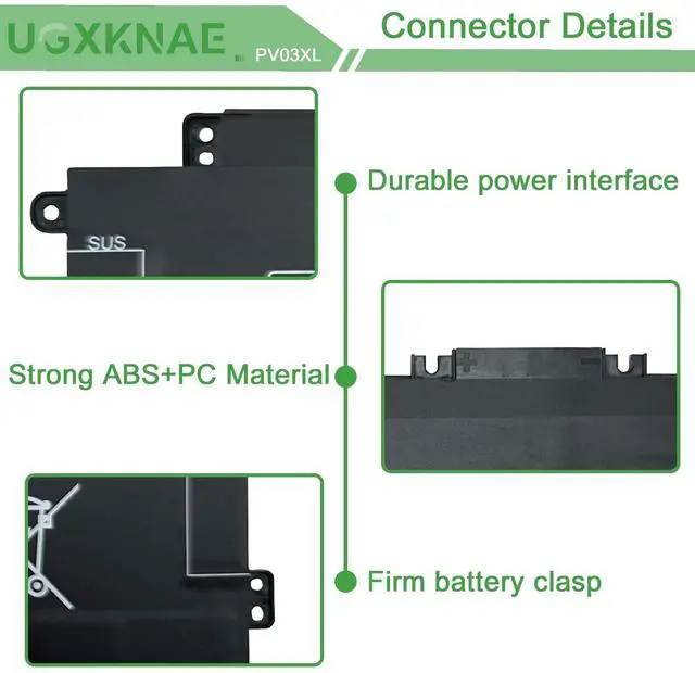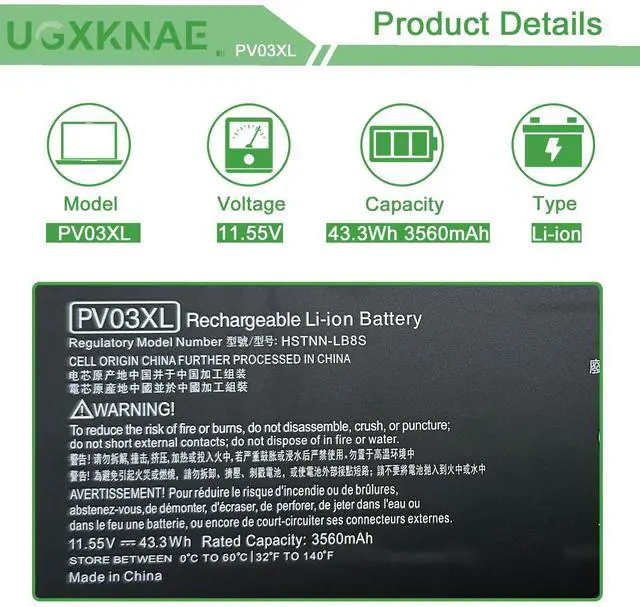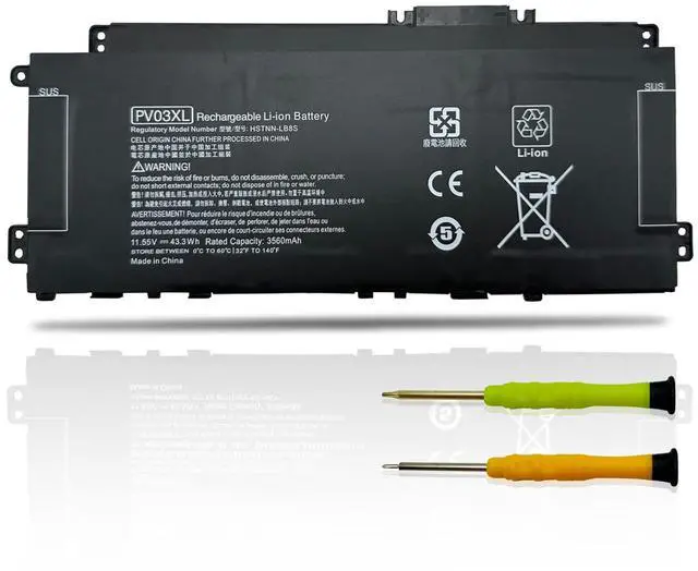 Specifications: Model Name: PV03XL standard Rechargeable Li-ion Battery; Battery Type: Lithium_ion; Voltage: 11.55V; Capacity: 43.3Wh/3560mAh.Cells: 3-cells; Color: Black. Packages includes:1x PV03XL Laptop Battery ,2 x Screwdrivers for easy installation,1x Instruction