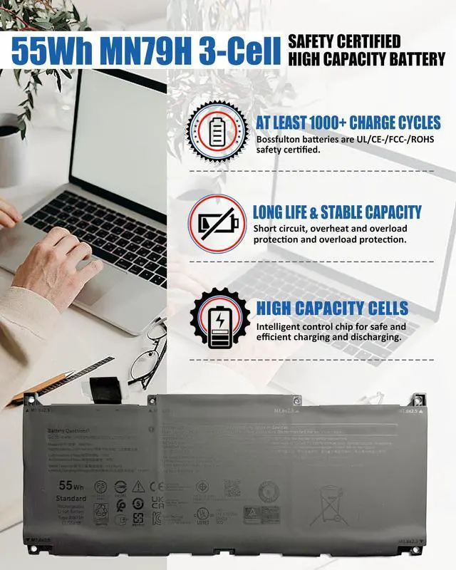 bossfulton 55Wh MN79H Battery Replacement for Dell XPS 9320, XPS 13 Plus 9320, XPS 13 9340 9345 Series Notebook P51G P151G001 P151G002 NXRKW 2FVJM J7H5M 0J7H5M TR7FC 11.55V 5243mAh 3-Cell