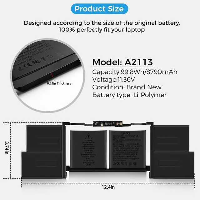 Specification of the BatteryBattery Model:A2113.Capacity: 8790mAh/99.8Wh, Voltage: 11.36V. Battery Type: Li-Polymer;100% brand new from manufacture