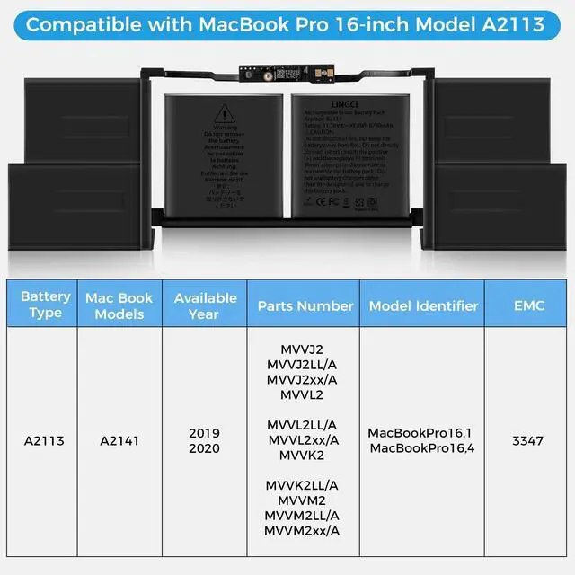 LINGCI A2113 A2141 Battery Replacement for MacBook Pro 16 Inch A2141 Retina Series (Year 2019 2020) (EMC 3347, MVVL2 MVVL2LL/A MVVM2 MVVM2LL/A MVVJ2 MVVJ2LL/A MVVK2) 11.36V 98.8W h 8790mAh
