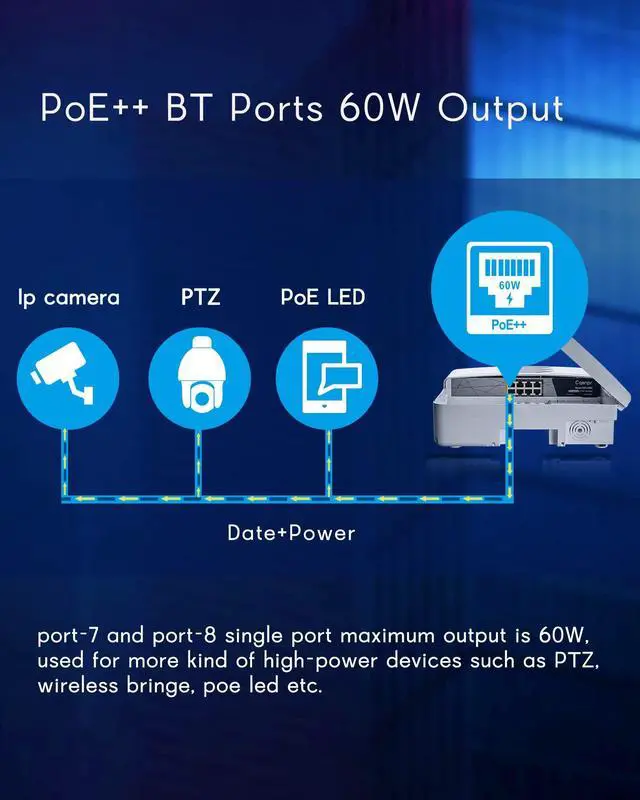 High power output: Comply with IEEE 802.3af/at/bt standard, Maximum support 120W high output power,1-6 port single port MAX output power is 30W, port(7, 8) MAX output power is 60W, capable of supply high power devices such as PTZ cameras, PoE LED lights, IP Speakers etc.