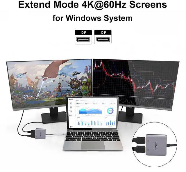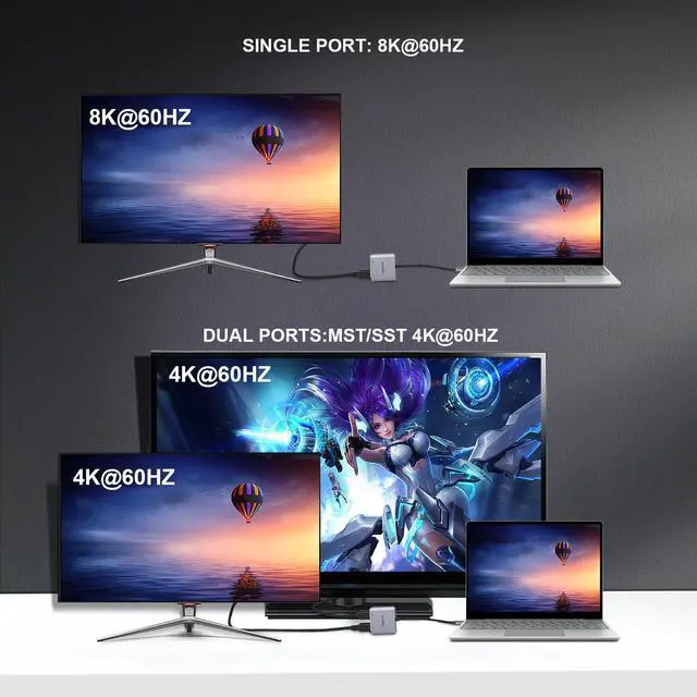 8K60Hz UHD Resolution/Audio & Video Sync Transmissiom:UAYXILI DP to Dual DP adapter for dual monitor extended Display, DP1.4 for single displayport screen resolution up to 8K@60Hz and dual display port screen resolution up to 4K@60Hz.(Note: To achieve single 8K resolution, make sure that the input device ports are at a minimum of the DP 1.4 version that support 8K at the same time).Ideal for multi-stream displays in schools, conference