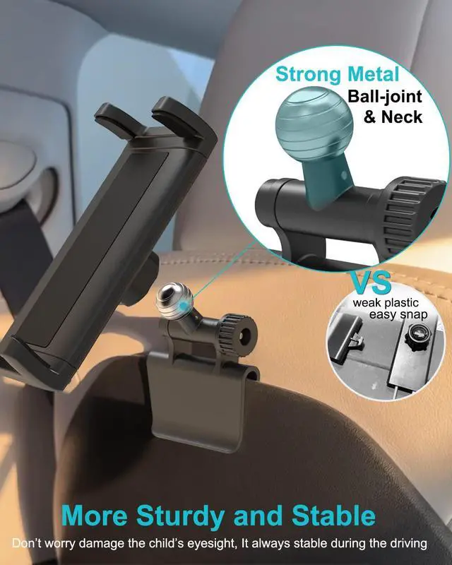 Sturdy & Stable HolderThe ball head & neck of tablet headrest mount is made of strong metal(hard to break), and the holder with silicone pads can protect the tablet from scratch. Firmly holds phone/ tablet in place.