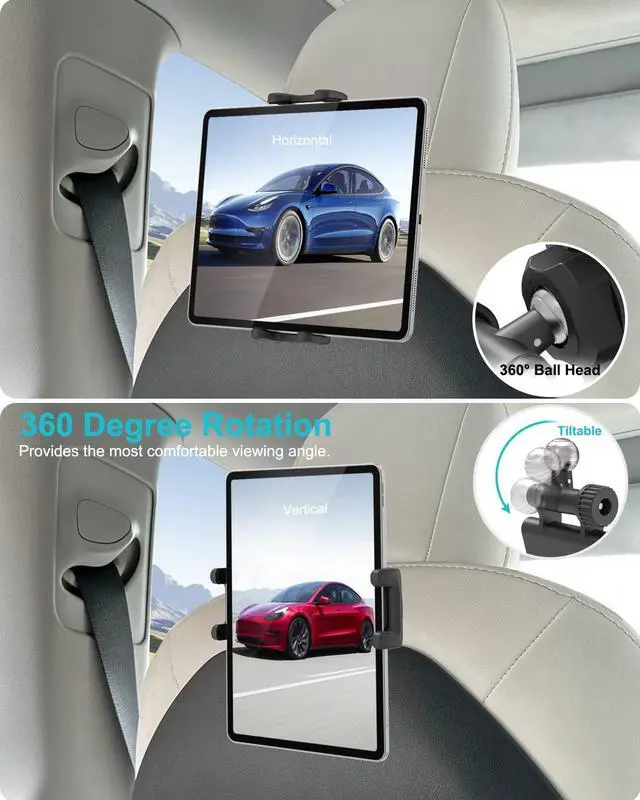 360 Degree RotationThis headrest ipad holder for Tesla is equiped with 360° rotation ball joint and the neck can tilt. Provide a comfortable viewing angle for you, free your hands and protect your child's cervical spine on the road travel.