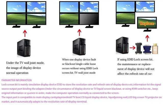 HDMI Edid Emulator Perfect Matching SynchronousOur advanced technology guarantees flawless synchronization, keeping your displays and PC in perfect "sync" all the time, EDID emulator solve a "loss of sync" issue with multiple displays. Enjoy uninterrupted visuals withoutNo more desktop re-arranging each time you power on or off a TV.Insert EDID turn off the TV or even unplug the HDMI and your PC wont skip a beat!