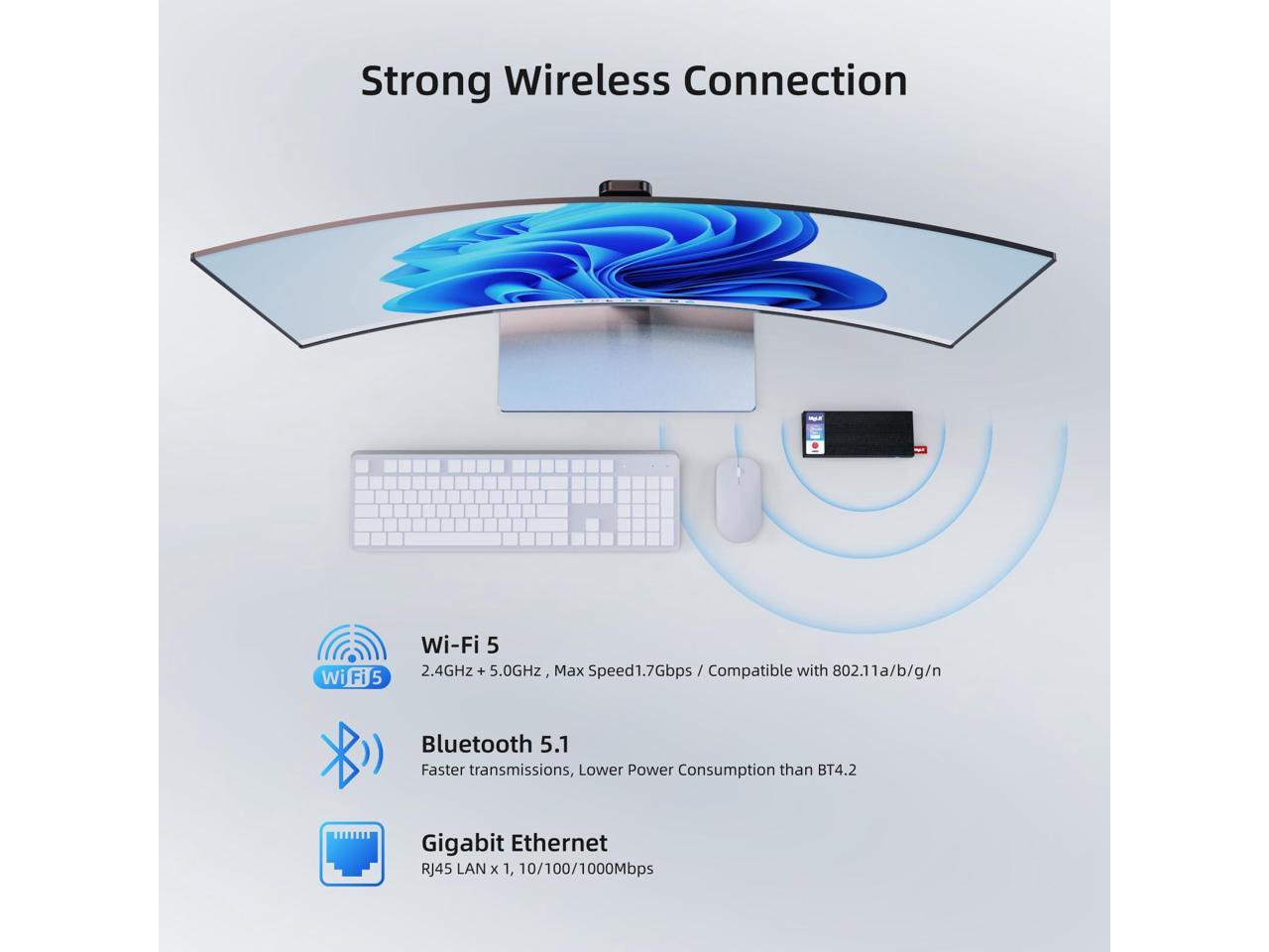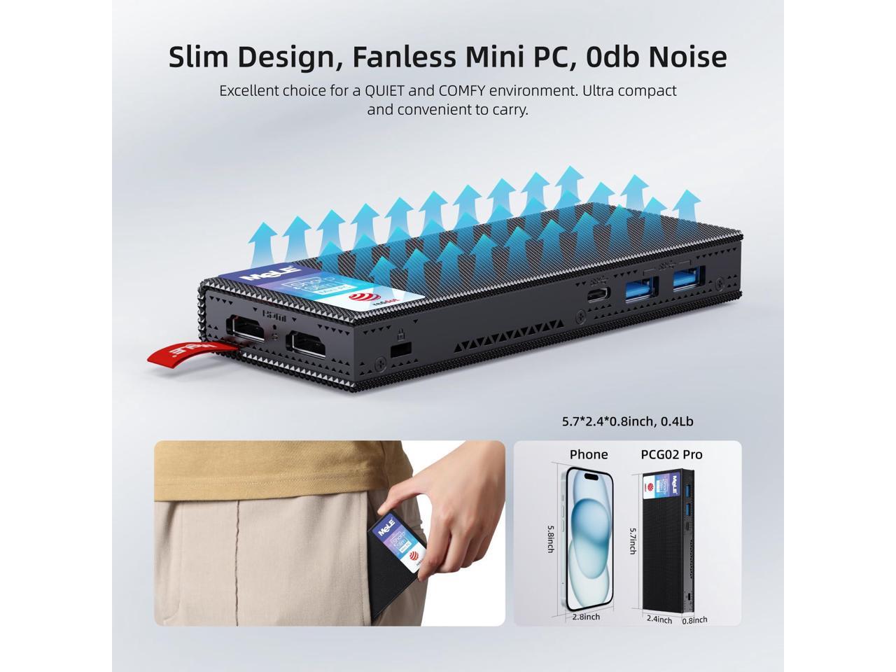 - Ultra Slim & Fanless Design -- This small form factor pc is only 5.7x2.4x0.8inch, 0.4Lb. Fanless design for 0dB noise offers a silent and comfy