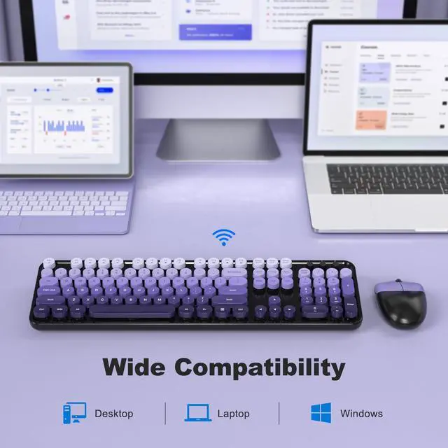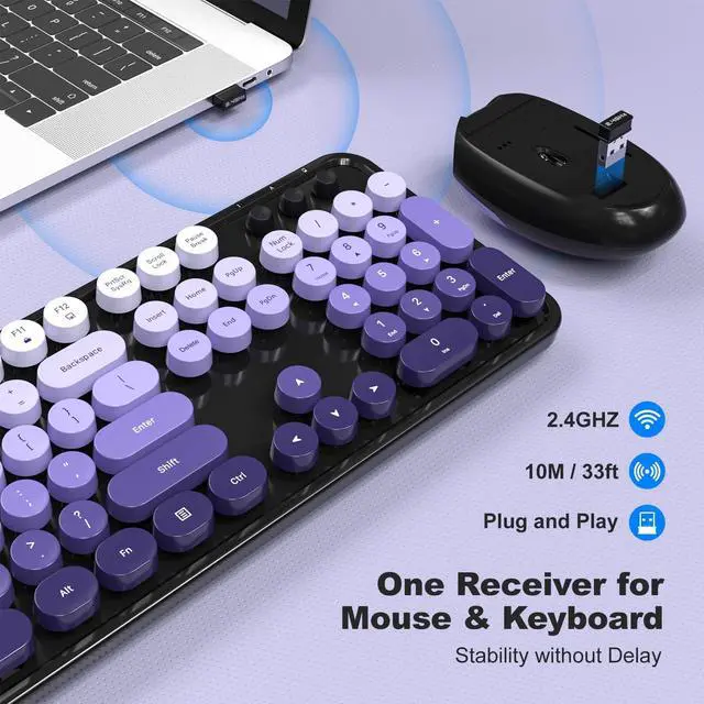 Detachable Colorful KeycapsEnhance your typing comfort with our colorful wireless keyboard and mouse set, featuring vintage typewriter-inspired rounded keycaps. Inject vibrancy into your workspace with vibrant colors, breaking away from traditional monotony.