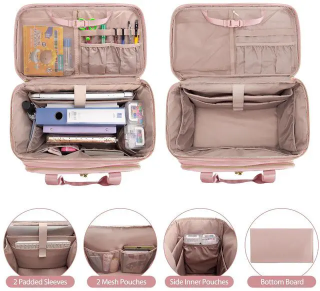 GENEROUS SPACE - Rolling teacher bag measure 16.1x8.2x12.6 inches. The main compartment is equipped with 2 padded sleeves for 15.6 laptop and tablet. Extra large capacity with 4 elastic pouches is roomy enough to accommodate binders, file folders, books. Top 6 elastic slots and a large mesh pocket for highlighters and other essentials. (Empty bag only)