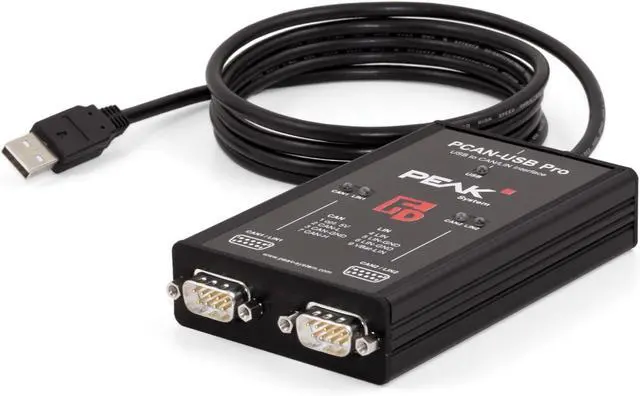 The PCAN-USB-PRO FD adapter connects a USB port to CAN and LIN networks. Two CAN/LIN buses can be connected at the same time, with up to software four connections available using appropriate adapter cables (2 x CAN, 2 x LIN). The CAN USB PRO FD is housed in a robust aluminum casing making the PCAN-USB Pro FD adapter suitable for all types of applications.