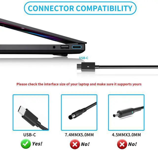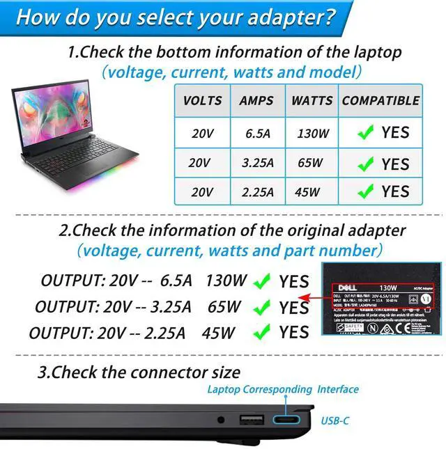REPLACEMENT FOR DELL USB C CHARGER 130W SPECIFICATIONS: Input: 100-240V 50-60Hz, Output: 5V/9V/15V/20V - 1A/6.5A 130W, Connector Size: USB Type C. PLEASE CONFIRM THE SPECIFICATIONS OF YOUR DELL POWER ADAPTER BEFORE ORDERING