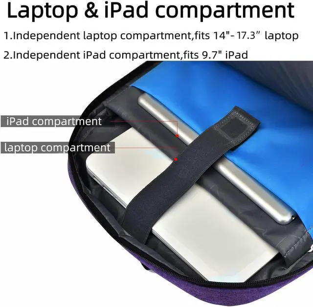 COMPARTMENT CAPACITY & POCKETS:Separate laptop compartment fits 17/15/14/13 Inch Macbook/Laptop.Separate compartment Fits Maximum 9.7 iPad.Main compartment roomy for tech electronics accessories,3-5 days clothing,5 A4 Books.Front compartment with 2 Pockets for power Bank and Shaver,2 Pen pockets and key fob hook.Pocket for socks and gloves.Front hidden zipper pocket fits papers.2 mesh pockets for water bottle and compact umbrella.Strap pocket fits bus card and Metro Card,One glasses hold strip.