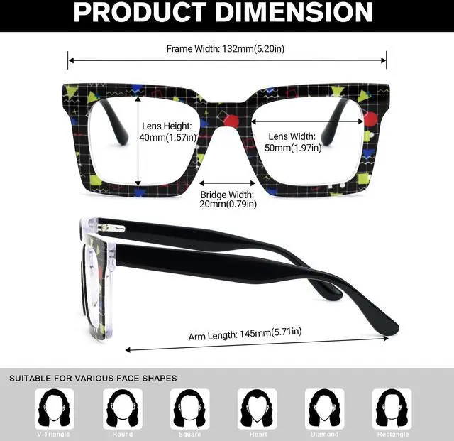 Unique Design With unique Memphis style, geometric pattern and bright colors, this square eyeglasses frame shows individual expression and confident style, allowing you to experience the power of art and fashion. In addition, it delivers a stylish and casual impression.