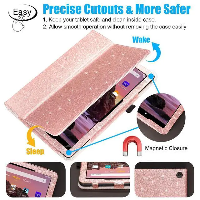 COMFORTABLE FEATURES: Our 10 inch tablet case has a magnetic strip built-in, it allows your tablet to automatically wake up or go to sleep when the lid is opened and closed. This tablet cover has 2 card pockets on the inside to keep your essential cards or cash safe. The tablet case features a hand strap on the back, so you can hold it more easily. Our Fire 10 tablet case has a convenient pen holder, so you can securely store your stylus or pen in there while not using it. ^^