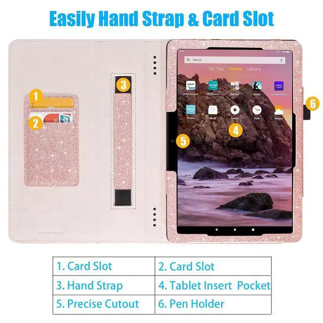 DMLuna Case for All-New Fire HD 10 & 10 Plus Tablet (13th / 11th Generation, 2023/2021 Release) 10.1", Slim Cover with Folding Stand, Auto Wake/Sleep, Hand Strap, Card Slot - Glitter Rose