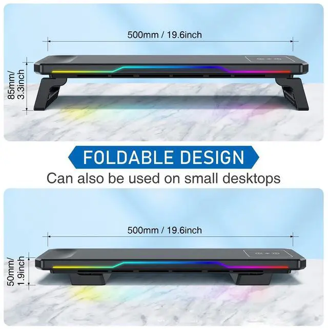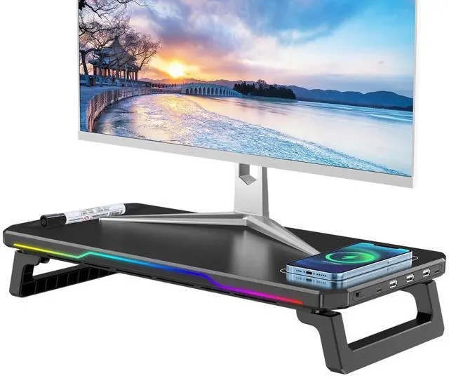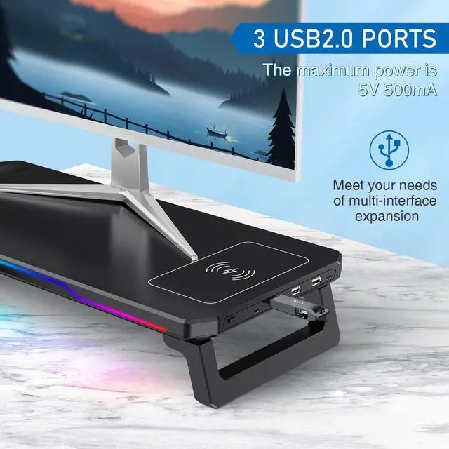 ALL-IN-ONE DESK SOLUTION Declutter your gaming or office desk! This multifunctional stand combines a sturdy monitor riser, a 15W fast wireless charger, a 4-port USB hub (3xUSB 3.0 + 1xType-C), vibrant RGB lighting, and extra storage space underneath for your keyboard/mouse. No need for multiple separate gadgets. ^^ Faster Charging & Wider CompatibilityCharge your devices at super speed! Features a 15W Qi-certified wireless charging pad (3x faster than standard 5W chargers), compatible with iPhone 15/14/13, Samsung S23/S22, AirPods, and more. The built-in USB hub keeps all your cables organized and connected to your laptop/PC/Mac.