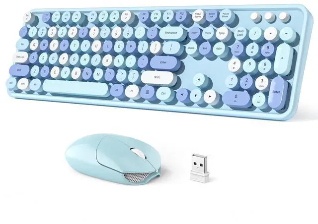 Cute Wireless KeyboardThe inspiration for these cute rounded keys comes from vintage typewriters offering you visual enjoyment and a retro feeling to type. With colorful key caps, make you be distinctive in the office and work full of fun. ^^ Plug and PlayOne USB 2.4GH z nano receiver for keyboard and mouse, does not need any extra software, super easy to use. All you have to do is plug the USB receiver and then give them seconds to install automatically. ^^ Upgrading TechnologyThe keycaps are made of ABS environment-friendly plastic characterized by ergonomic design and a comfortable feel.