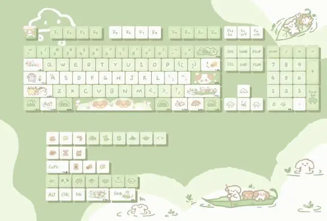 Cute Green Puppy Theme KeycapsGK GAMAKAY is committed to creating a captivating keyboard aesthetic by combining classic patterns with high-quality keycaps. Our advanced five-sided dye-sublimation process ensures an incredibly stunning look for your keyboard. Keycaps OnlyPlease note that this product includes keycaps only. The keyboard featured in the picture is for demonstration purposes and is not available for sale. ^^ MOA Profile KeycapsErgonomic comfort allows you to use stress-free Arc layout, concave arc, the area where fingers touch the keycap is larger, and the touch is more silky. Give you the highest comfort when using.
