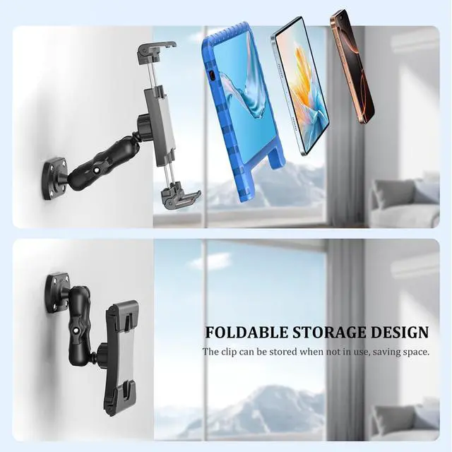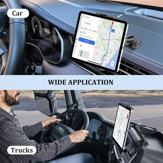 Easily rotate the screen to any optimal viewing angle, whether in landscape or portrait mode. ^^ Widely Compatible with 5-13 DevicesThis ipad holder for car has a powerful clamping capacity that is compatible with a variety of tablets, mobile phones and e-readers from 5 to 13 inches. Whether it is an iPad, Samsung tablet, Kindle or a large-screen mobile phone, it can be securely and firmly fixed. ^^ Multi-Scenario ApplicationThe ipad car holder Designed for demanding environments. Suitable for vehicles like trucks and construction machinery, it can also be securely mounted on any flat surface, including walls, desks, and kitchen counters.