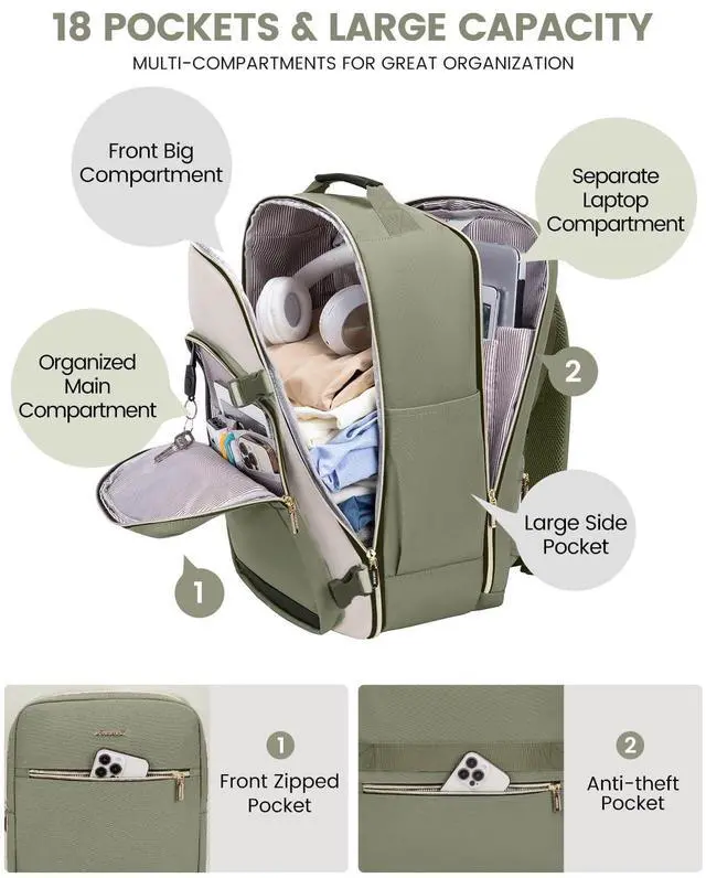 Versatile & Airline ApprovedMeasuring 20.5 *14*8 inches, this carry on backpack fits under the seat or in the overhead compartment, approved by Spirit, Frontier, JetBlue, and other budget-friendly airlines, making it the perfect personal item for air travel. ^^ Spacious & OrganizedWith a 56L capacity, 4 compartments, and a lot of pockets, designed to allow you to easily separate and organize your travel personal items, this travel backpack can accommodate 8-10 days worth of travel items. ^^ 3 Extra Packing Cubes & Wet PocketsThis carry-on bag includes 3 extra packing cubes 2 storage bags and a shoe bag as well as a built-in wet compartment pocket.