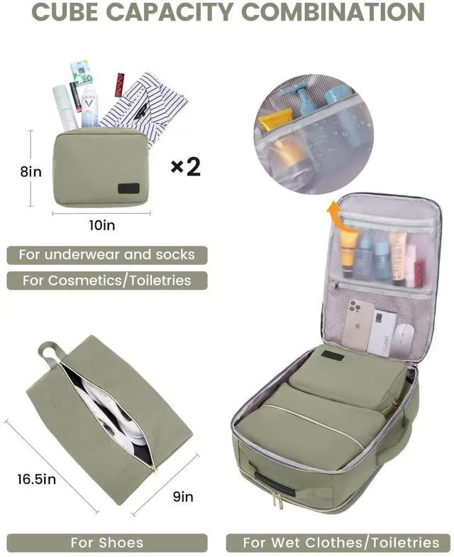 • 3 Extra Packing Cubes & Wet PocketsThis carry-on bag includes 3 extra packing cubes 2 storage bags and a shoe bag as well as a built-in wet compartment pocket. Perfect for storing wet clothes, towels, and toiletries, these packing accessories ensure your belongings remain dry and prevent any leaks or moisture from affecting your other items.