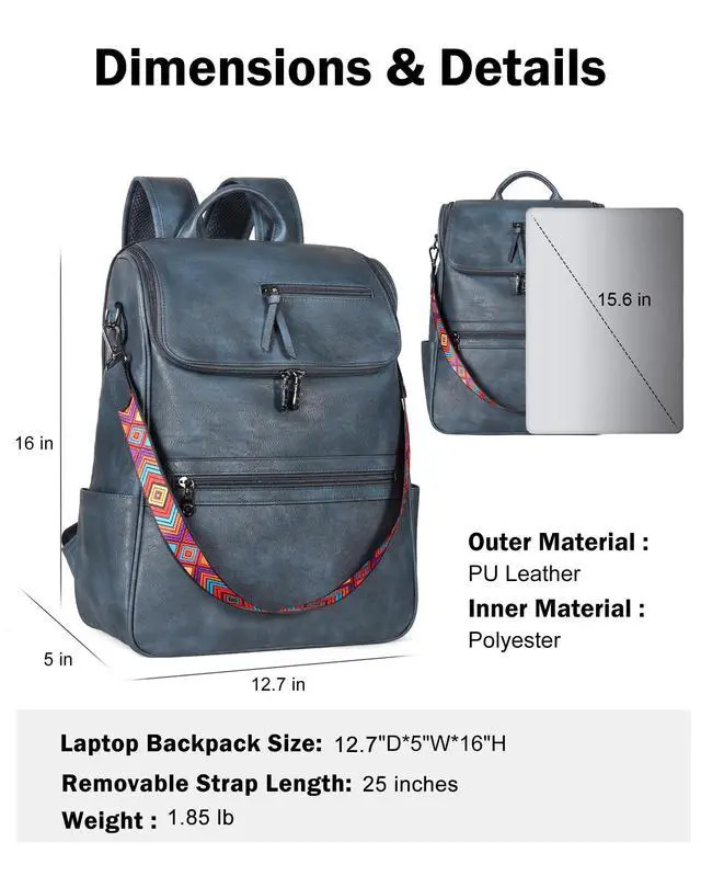 Quality Materials: 12.7"W *5"D*16"H, 1.85 lb. This women's leather laptop backpack is made of the latest waterproof PU vegan leather, soft and retro, quality hardware, smooth zipper without sticking, and reinforced design at the connection between the shoulder strap and backpack, making the leather backpack more durable. So this is a sturdy and stylish laptop backpack.