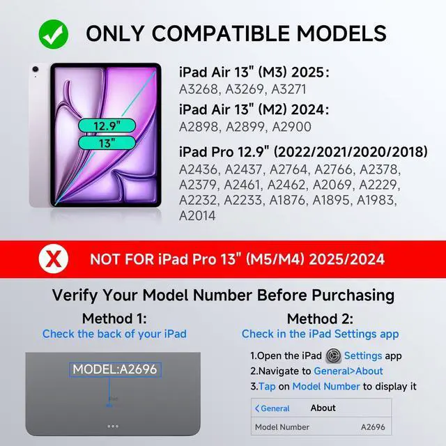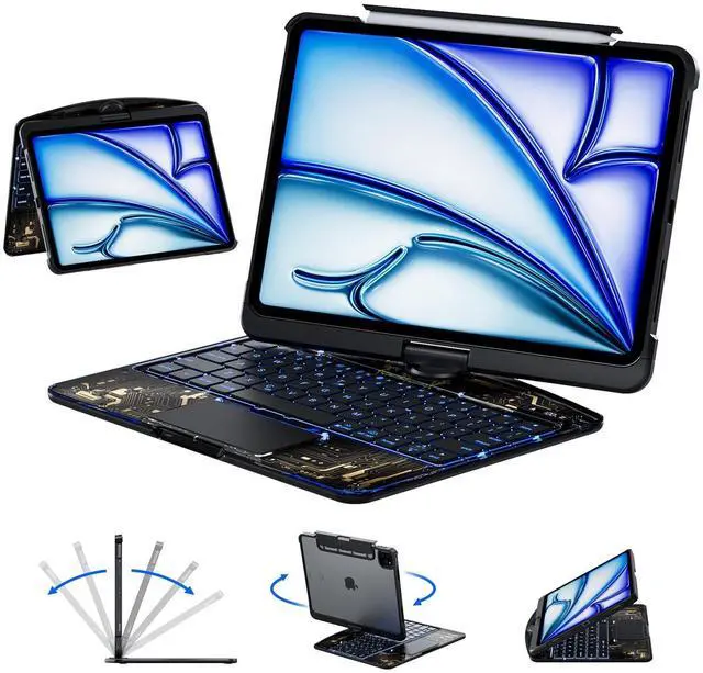 Unique Transparent Design AND Multiple Compatibility Designed exclusively for iPad Air 13 inch (M3 2025 / M2 2024), iPad Pro 12.9 inch (2022/2021/2020/2018), models (A2898A2899A2900A3268A3269A3271A2436A2437A2764A2766A2378A2461A2379A2462A2229A2069A2232A2233A1876A2014A1895A1983). Please confirm your iPad model before purchasing. ^^ 7 Colors RGB Backlit Keys AND 3 Adjustable Brightness Levels The transparent ipad keyboard case comes with 7 different color-coordinated RGB backlit, and the backlit projects beautiful colors through laser-etched key characters and letters. 7 RGB colours backlit keys for comfort and productivity in any dimly lit area. ^^ 360 Rotatable Stand AND 7 Viewing Angles Effortlessly pivot your iPad for typing, working, sketching, watching videos, or video calls.