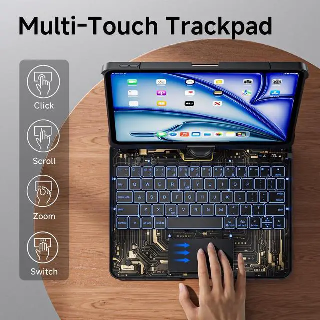The sturdy stand provides a secure hold in any position for optimal comfort and productivity. ^^ Real-Time Battery Status AND Long Battery Life Equipped with unique battery display and a powerful rechargeable battery, The keyboard case offers 90days of use on a single charge via the included USB-C cable. This battery display clearly shows the iPad keyboard case's battery level, eliminating your anxiety about the unknown remaining battery. ^^ Secure Stylus Holder AND Full Protection Features a dedicated slot that securely stores and enables charging for your 2nd-generation stylus pen (compatible with Apple Pencil), ensuring it's always at hand.