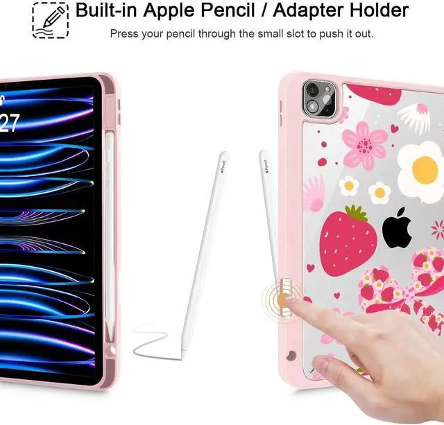 Lepeoac Case for iPad Pro 11 inch (4th, 3rd, 2nd & 1st Gen) 2022 2021 2020 2018, Buit in Pencil Holder with Shockproof Cover Clear Shell + Auto Wake/Sleep,Strawberry Bow
