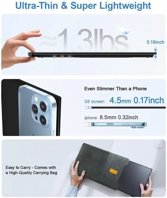 Ultra-Slim & Ultra-LightThe upgraded ultra-slim laptop screen extender is just 6.5 mm thickthinner than most smartphonesand built for true portability. Weighing only about 1.3 lbs, just slightly heavier than a bottle of water, it fits effortlessly into any bag without adding bulk or weight, making travel a breeze. Whether you're a frequent traveler, digital nomad, or remote worker, this lightweight screen extender is the perfect productivity companion on the go. It is also a thoughtful and practical gift for anyone who needs to work efficiently. ^^ Upgraded Aluminum Alloy Shell & 1080P FHD DisplayThis portable laptop monitor adopts a sturdy and durable anodized aluminum case.