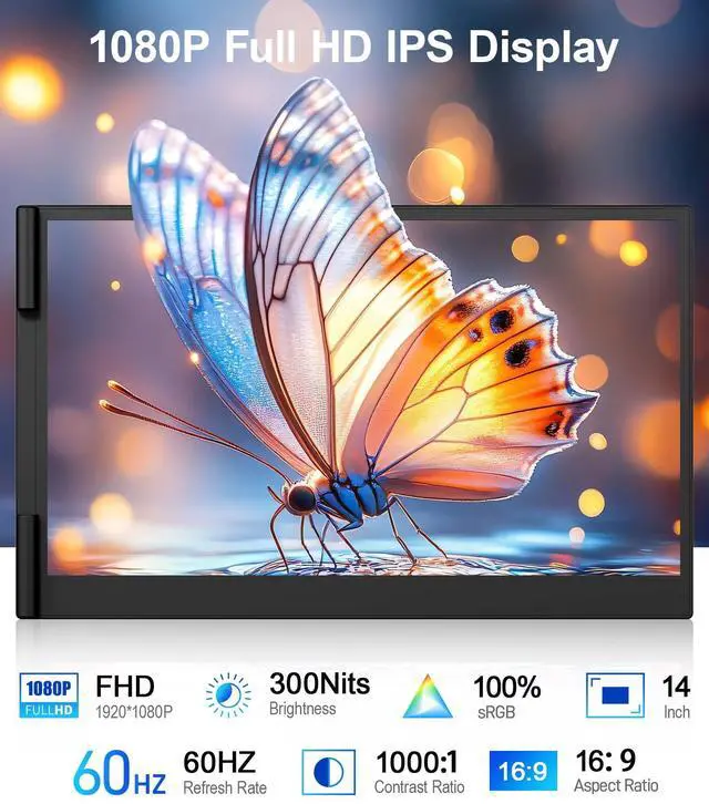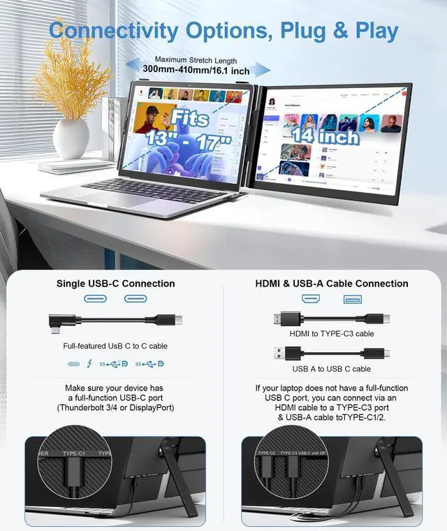 Enjoy seamless multitasking across dual screens and boost your productivity by up to 200%. The built-in top hook securely mounts the portable monitor to your laptop, while the adjustable rear stand offers flexible viewing angles and enhanced screen privacymaking it an ideal solution for both personal and professional use. ^^ Plug and Play, Simple ConnectionThis portable monitor for laptops comes with all the necessary cables for a seamless and hassle-free setup; If your laptop has a full-function Type-C port (labeled as Thunderbolt 3.0 / 4.0, supporting DP or video output), you can quickly connect with just a USB-C to USB-C cable; if your laptop does not have a full-function Type-C port, you can easily use both USB-A cable and HDMI cable to connect at the same time; if your extender screen has any display problems, please contact our after-sales team to solve it for you.