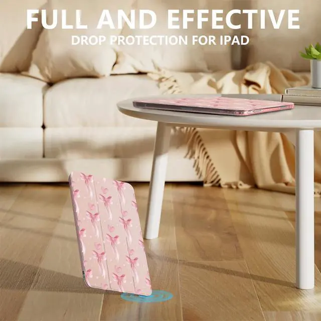 Protection: This kawaii girly bowknot case for ipad is made of two materials. The comfortable and soft silicone and high-quality durable TPU material provide a comfortable touch for the pad. The back of this pink heart bow case for ipad is made of soft TPU, which provides full body protection and is more durable than traditional silicone materials. It is less prone to yellowing, prevents scratches, and maximizes the protection of your pad from damage and scratchesAuto Wake/sleepBuilt-in magnetic strip, our pink heart bow case for ipad can automatically wakes or puts your tablet to sleep when the lid is opened and closed, protecting and extending battery life; precise cutout also completely supports newest touch ID key function. Built in pen holder ensures the safety of your pencil. Adjustable angleThe trifold stand shell design of this kawaii girly bowknot case forapple ipad can easily change the angle to meet your viewing and typing needs. This girly lovely aesthstic case for ipad can be folded into a stable triangle, firmly supporting your pad. Whether it's work, study, or watching movies, they can meet your needsPerfect