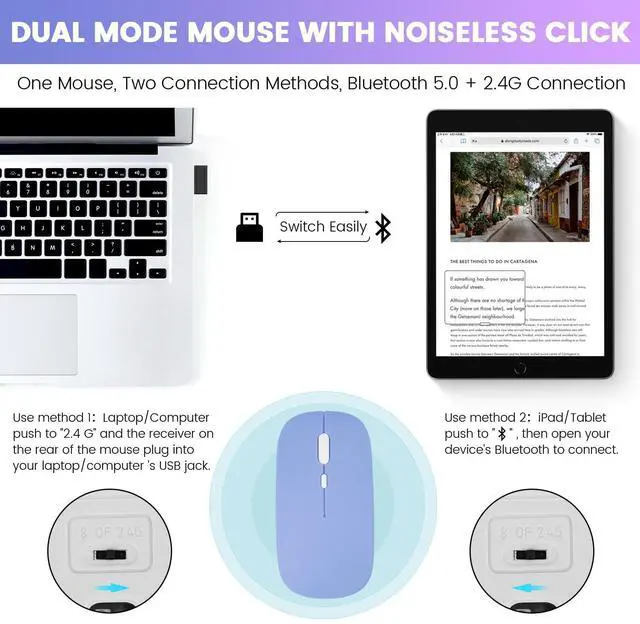 Wireless Mouse: The slim mini mouse adopts shapely, giving your palm plenty of support and seamlessly fits in your hand, so you can work or play comfortably for long hours. Compact and wireless, it can be taken anywhere you go as it fits easily in your laptop case or in a bag.
